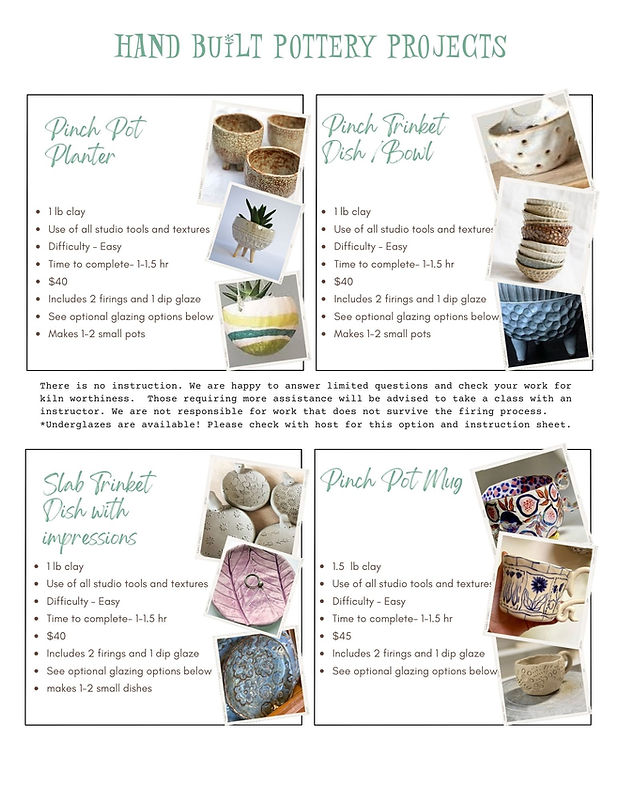 *Clay for your projects which includes 2 firings and white or clear house glaze or you can opt to return to glaze at our "Glayze Bar" after your pieces are fired and work with a "Glayze Tender" to glaze your pieces after they are bisque fired.